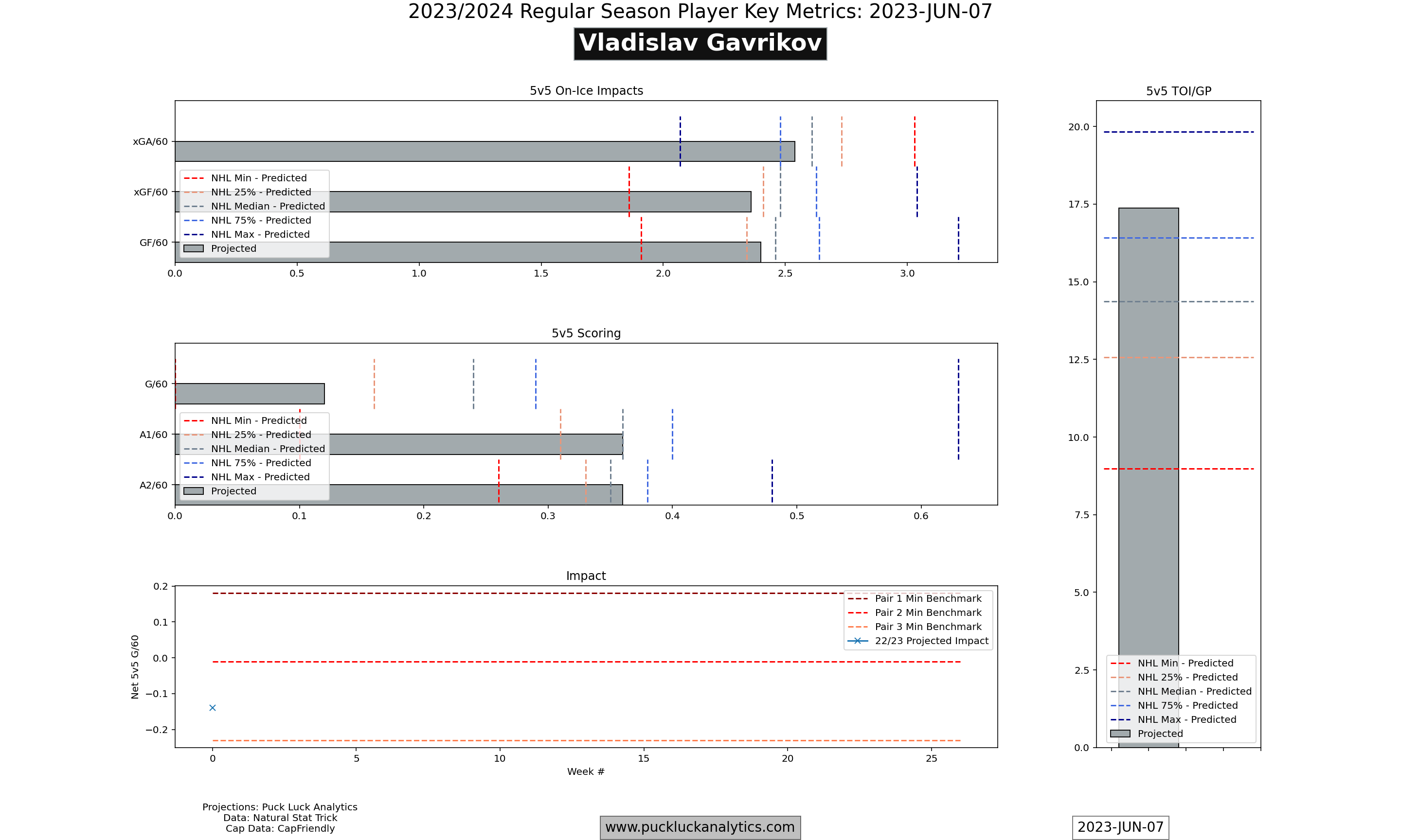 The Kings have been aggressive in their pursuit of veterans to add to their loaded prospect pool over the past few summers, first with the additions of Phillip Danault and Victor Arvidsson in 2021 and then Kevin Fiala in 2022. Inking Gavrikov to a new deal follows the trend, although cap efficiency is a concern this time. Gavrikov is projected to see big minutes by the model but with a modest third pair impact and has a cap efficiency that doesn’t look great as a result. If the Kings are able to settle him into a second or third pair role, they may be able to extract some incremental impact.