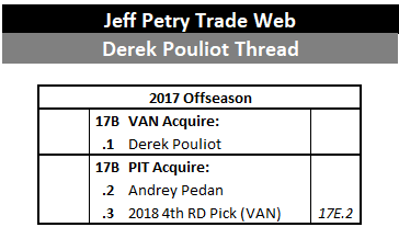 While the Penguins were winning back-to-back Stanley Cups, 2012 8th overall pick Derrick Pouliot was trying to make his mark in the NHL. He struggled to do so as other defensemen passed him on the depth chart and he managed only 11 NHL games in the 2016-2017 season. In the summer of 2017, the Penguins decided it was time to move on. They found a willing trade partner in the Vancouver Canucks and received Andrey Pedan and a 2018 4th round pick in exchange for the plateauing defenseman.