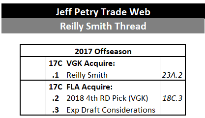 Vegas was ruthless in their approach ahead of the expansion draft, infamously making numerous trades for ‘Expansion Draft Considerations’ to allow other teams to protect additional players from selection during the expansion process. One such trade ties into the trade web, and lands a roster player on another future cup winning roster. In exchange for Expansion Draft Considerations and a 2018 4th round pick, the Florida Panthers traded Reilly Smith to Vegas.