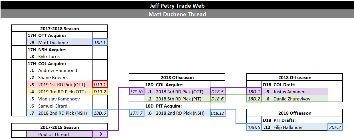 The Pittsburgh Penguins also made a deal to move up in the 2018 draft that ties into the trade web. They acquired a 2nd round pick from the Colorado Avalanche that was previously acquired by the Avs in the Matt Duchene trade. Going the other way was a 3rd round pick, previously acquired by Pittsburgh in the Derek Brassard trade, and a 5th round pick. With the picks, Colorado drafted Justus Annunen and Danila Zhuravlyov while Pittsburgh drafted Filip Hallander.