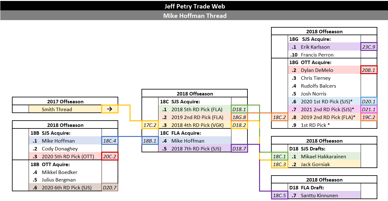 The Sharks flipped Hoffman to the Florida Panthers for draft picks just hours later. While none of the picks have amounted to much at the NHL level thus far, a couple of the picks help tie the trade web together. The Vegas 2018 4th round pick Florida sent in the deal was acquired in the Reilly Smith trade from the 2017 offseason and the Florida 2019 2nd round pick San Jose received was included in another deal between the Senators and Sharks later in the offseason.