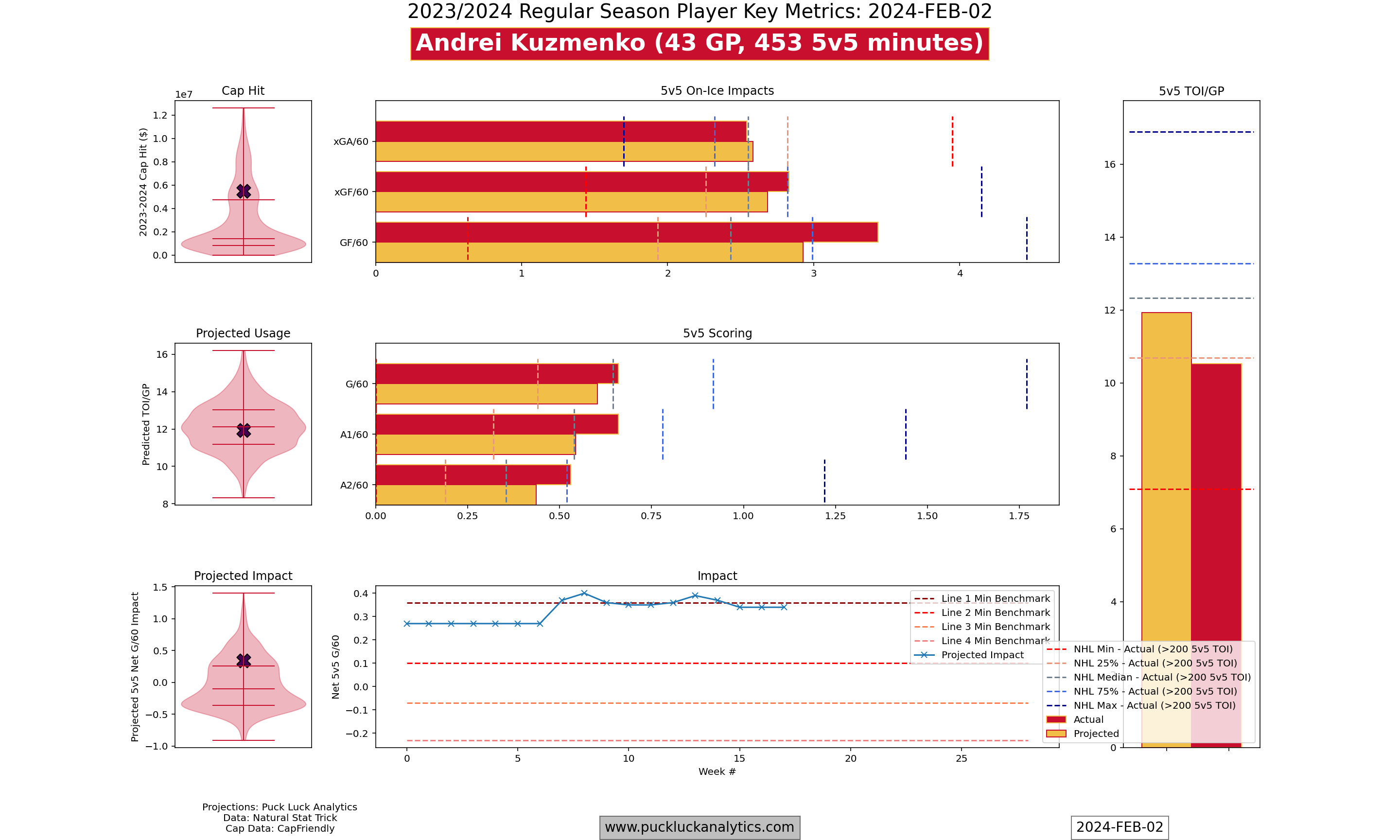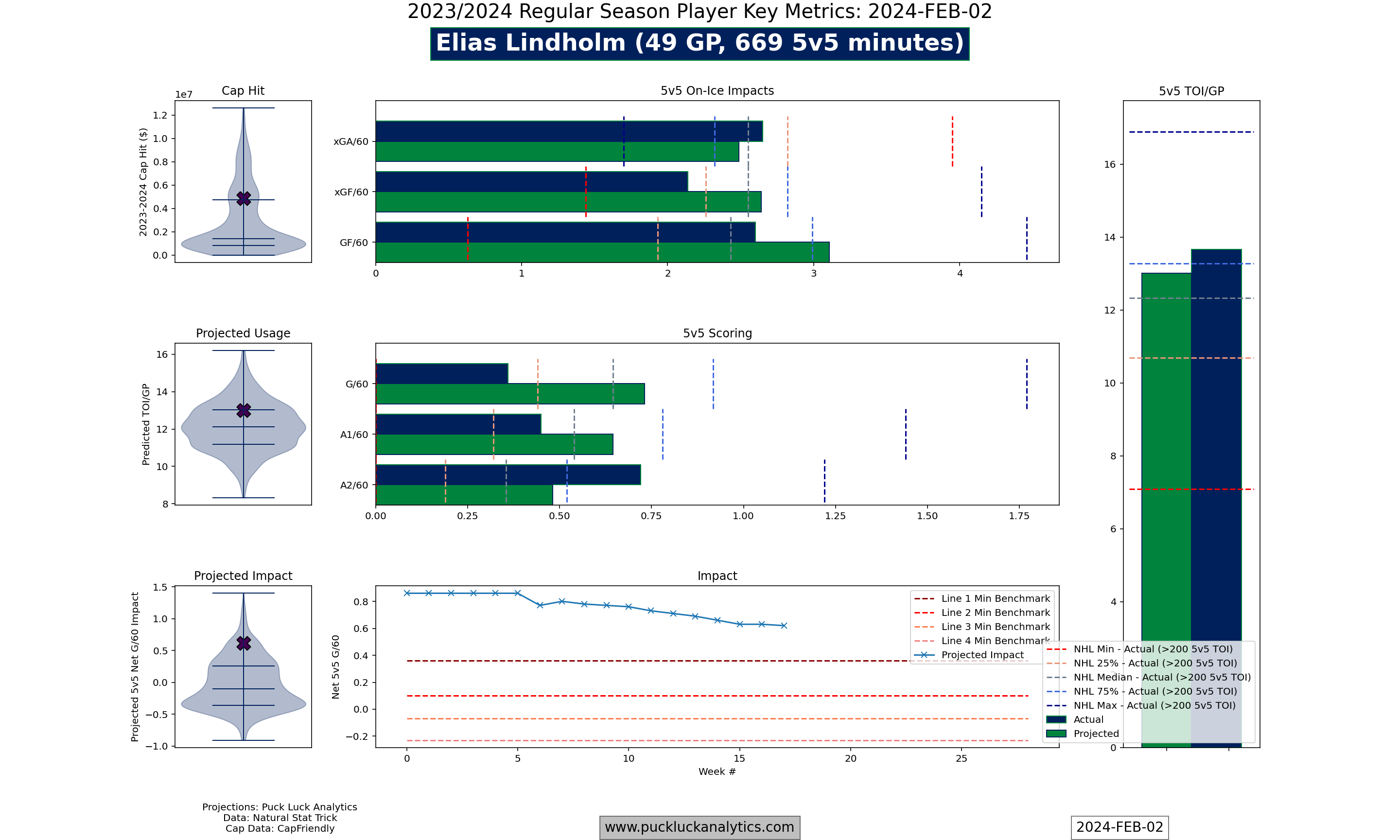 Lindholm is a 29 year old center in the final year of his current contract, with a cap hit of $4.85MM. His production has dropped off significantly over the past season and a half, following the departure of linemates Johnny Gaudreau and Matthew Tkachuk. His projected impact still looks strong, although this season’s 5v5 on-ice expected goal share is a concern.