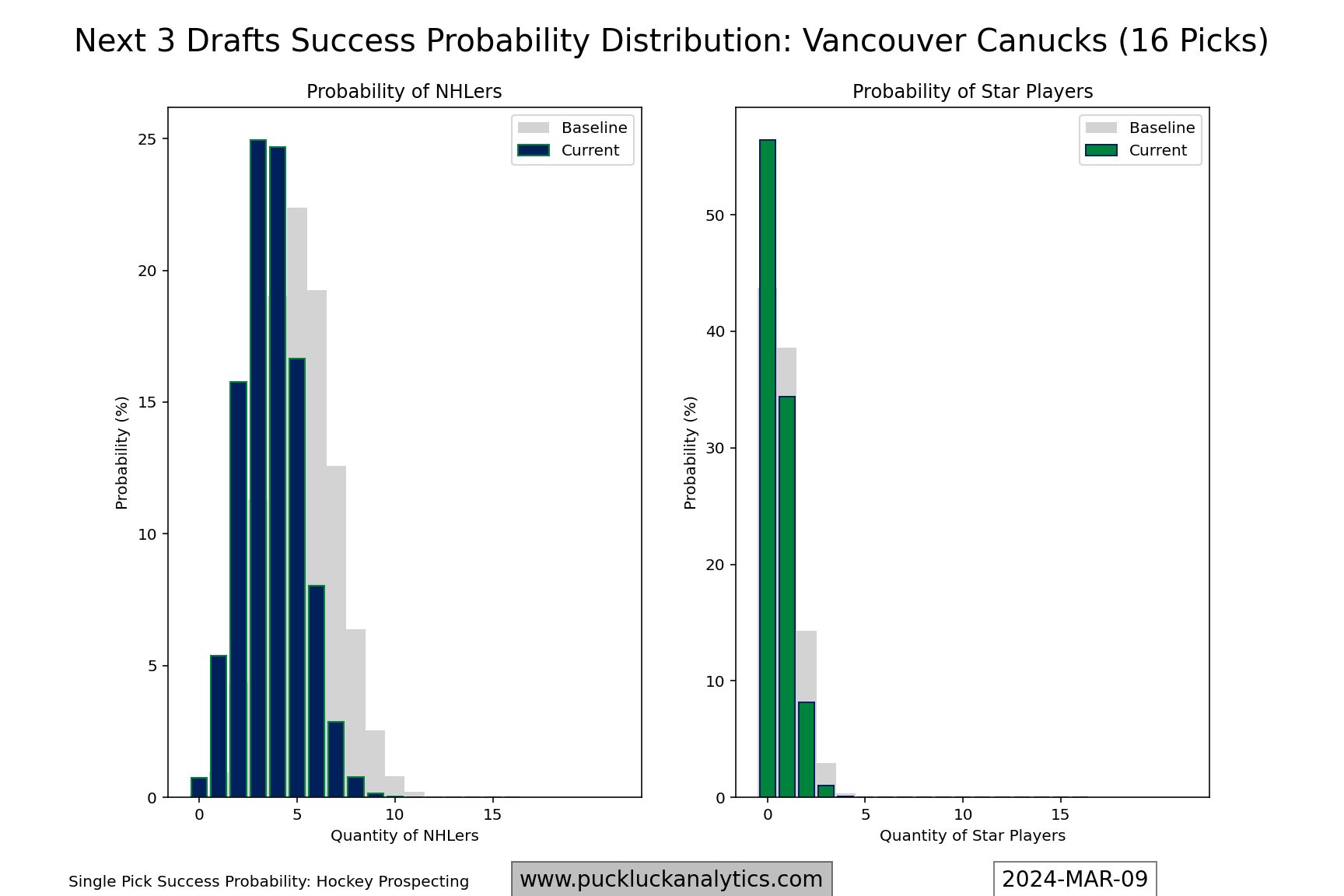 The Canucks retool hasn’t helped their future asset pool. It’s actually further depleted it as they prioritized adding younger NHL ready players early in the process and then loaded up with pending UFAs this season, using draft picks to help with both initiatives. Their draft pick pool has declined below baseline and Hockey Prospecting ranks Vancouver as the 30th prospect pool in the league.