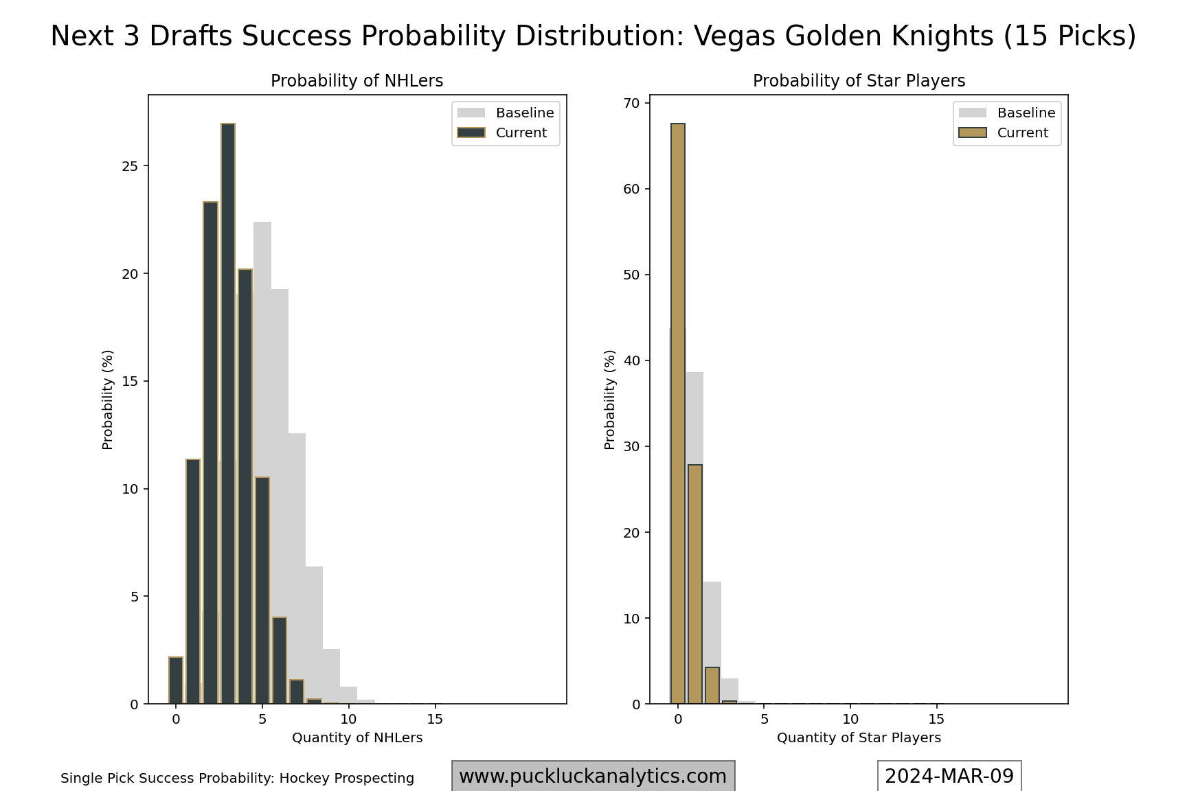 The Golden Knights have been the poster team for using high draft picks and prospects to add current wins to their roster. Hockey Prospecting ranks them 23rd in the NHL for their prospect pool, which is fairly devoid of blue chip prospects. Their future draft pick potential might be in even worse shape. They have one 1st Round pick in the next three drafts (the one for this year’s draft in Vegas) and only three additional picks in the 2024 draft (a 6th and two 7ths).