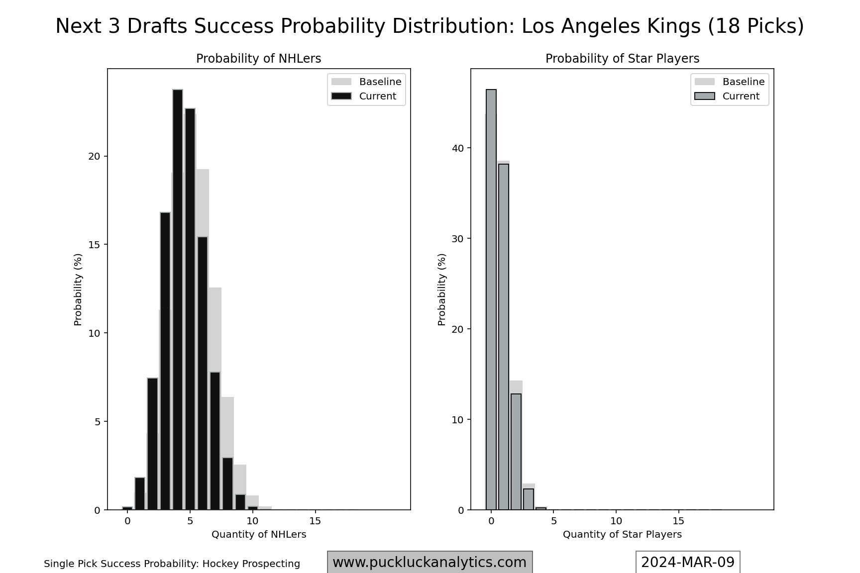 The Kings have been using their future assets to acquire players to help them over the hump over the past few seasons. Hockey Prospecting ranks the Kings prospect pool 12th in the NHL, which was one of the best in the league a couple of seasons ago. Their draft pick stockpile is down to 18 picks in the next three drafts, putting their draft success probability slightly below baseline.