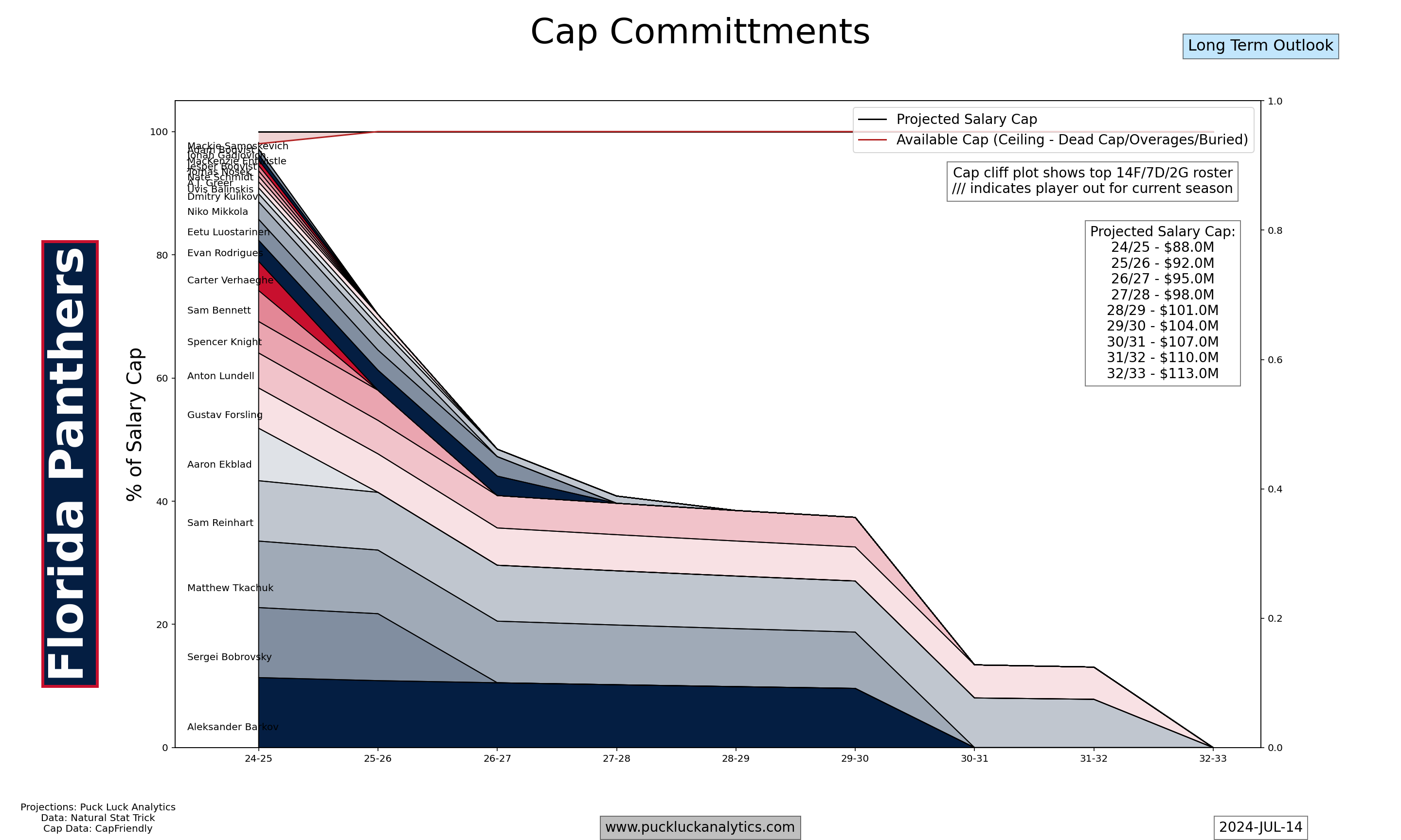 The Panthers had a number of pending UFAs on their championship roster, including a few significant pieces like Sam Reinhart and Brandon Montour. They still compared well to the rest of the league back in May, but those holes needed to be filled to keep pace with the competition over the summer. The Panthers had about 20% of their cap space for next season available going into the offseason.