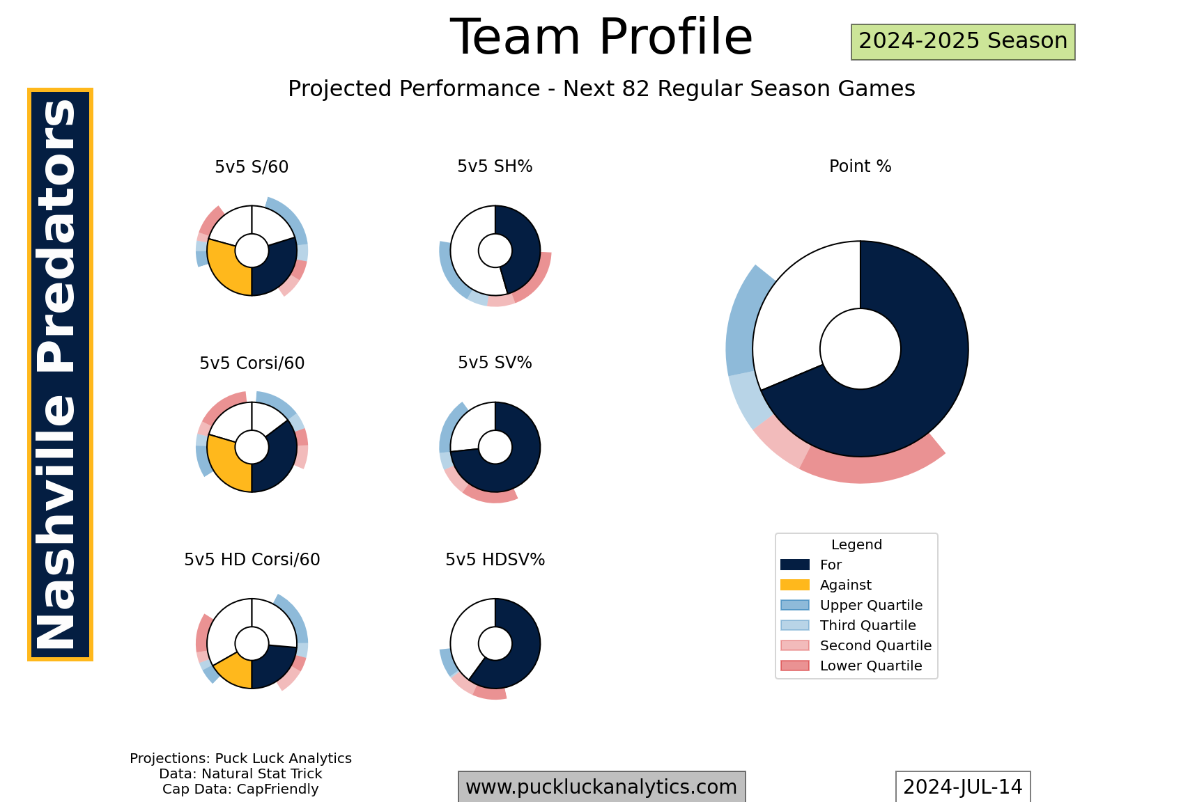 The main donut shows the target team’s projected stat from the model. The outer donut with the red and blue markers is a comparison to the rest of the NHL. Split into quartiles, there are 8 teams in each group. We can see here that the Predators are in the middle of the third quartile for projected P%. That puts them solidly in the top half and they should be expected to be in the playoff picture.