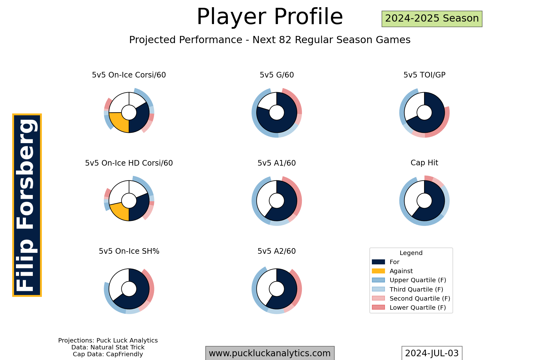 F – Filip Forsberg (30 / $8.5MM / 6Y): Forsberg has been one of the NHL’s best goal scorers over the past few years. He’s scored 109 regular season goals over the past three seasons. 67 of those have come at 5v5 which ranks 11th among all skaters. Now cresting 30, we should expect age to start reducing his impact but it will most likely be quite gradual over the next few seasons.