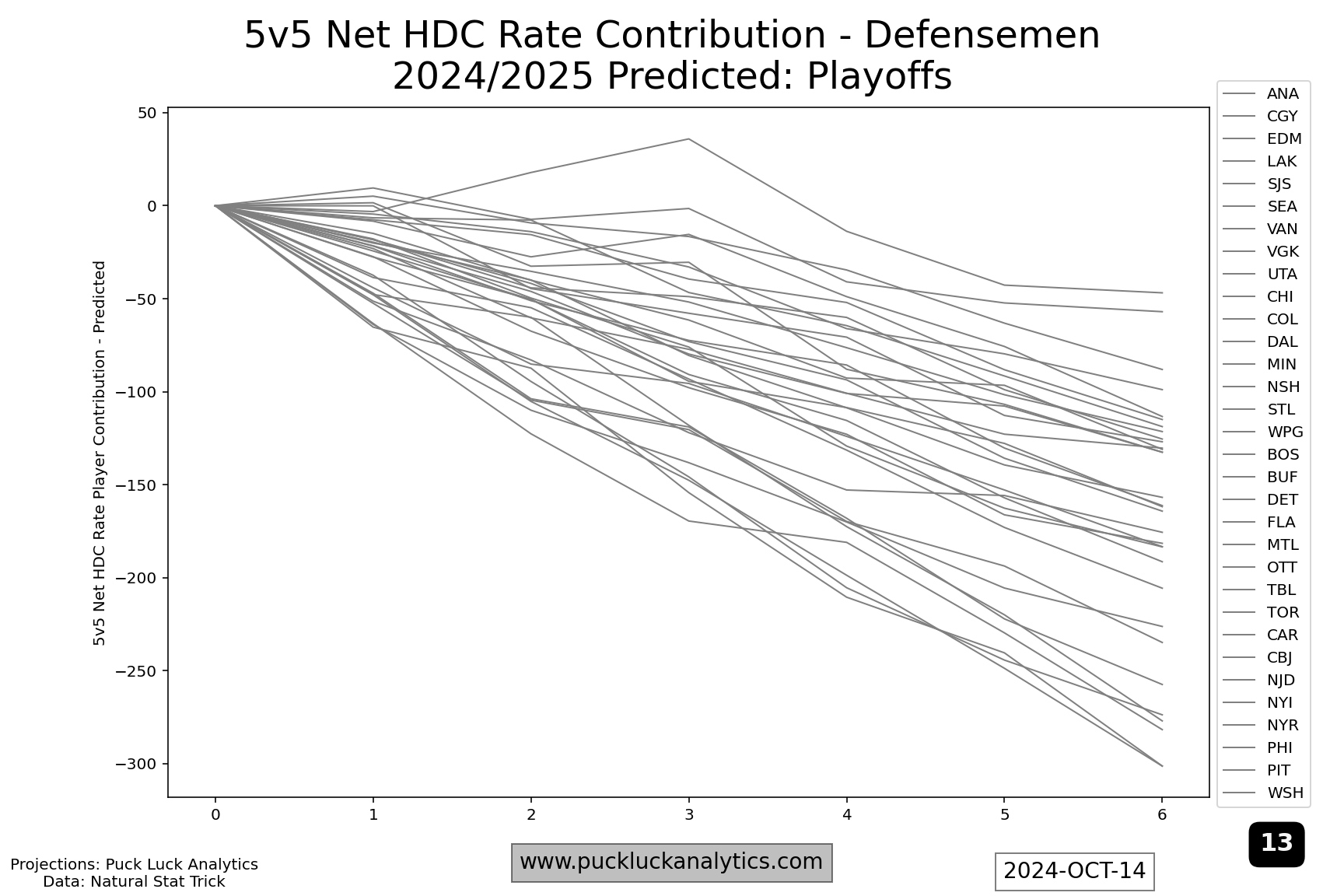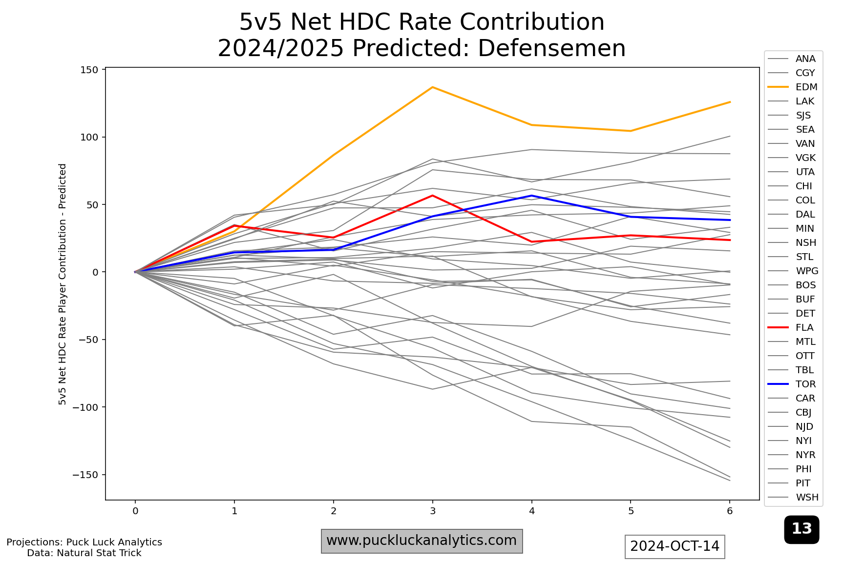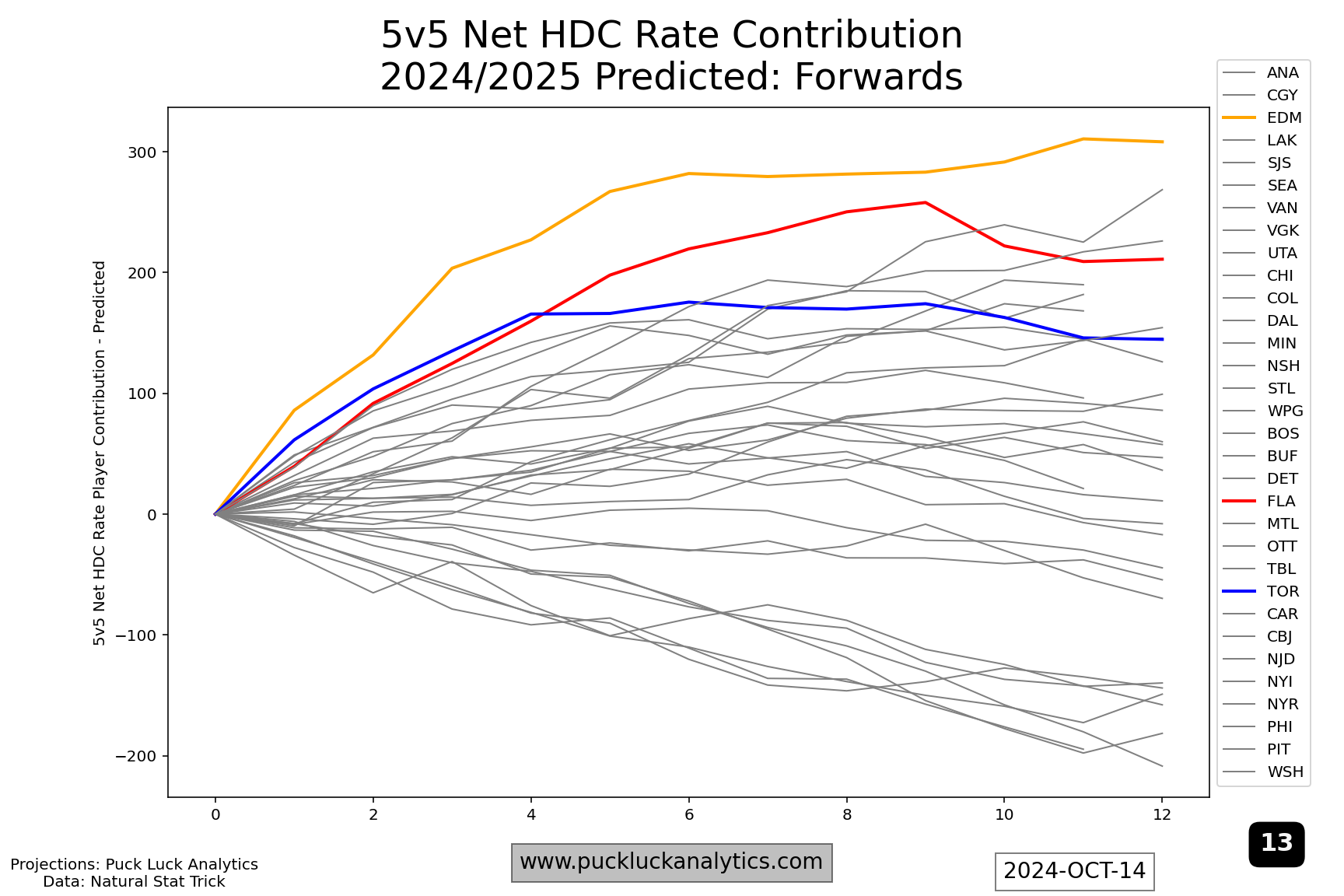 After both last year’s cup finalists, I included the Toronto Maple Leafs as a third example because they are the top rated team in the 2024/2025 model as of the start of the season. Still, their HDC Rate Contribution Worm show issues that could be more problematic in the playoffs than the two other examples. Their forward worm flattens around #5 on the depth chart. That means, come playoff time, they’re expected to be fighting a sub 50% 5v5 HDCF% for lines 2-4. A relatively flat start to the defense worm is the other issue that jumps out. The top pair will see the most ice time, potentially against the toughest competition, and having them run a net high danger Corsi deficit could be costly. Trade deadline targets should include a top pair D and middle six forwards, both with an considerable attention on high danger Corsi contributions.