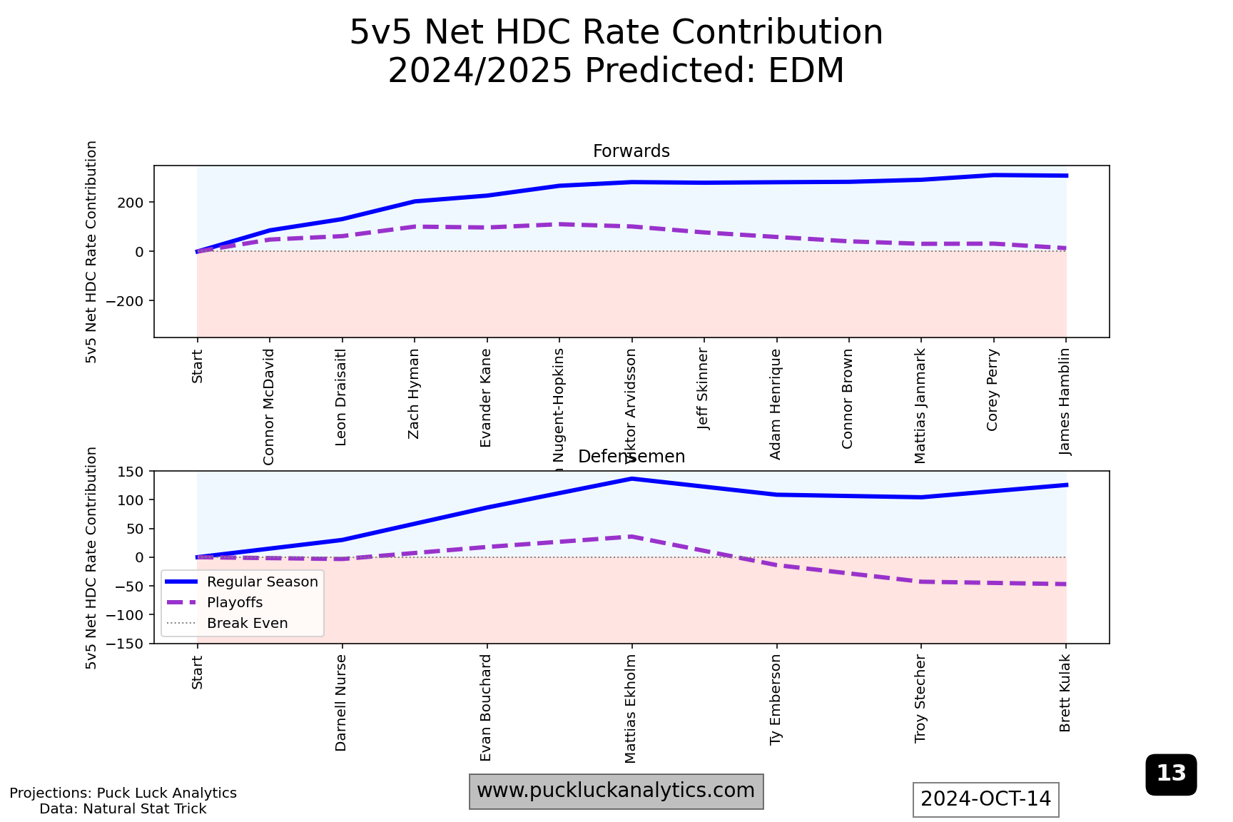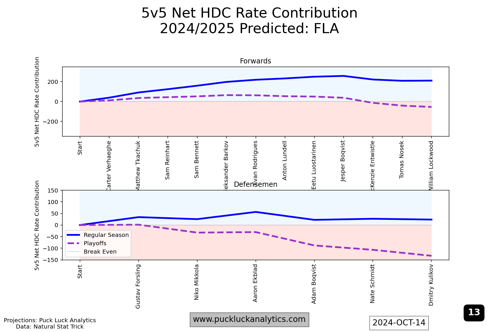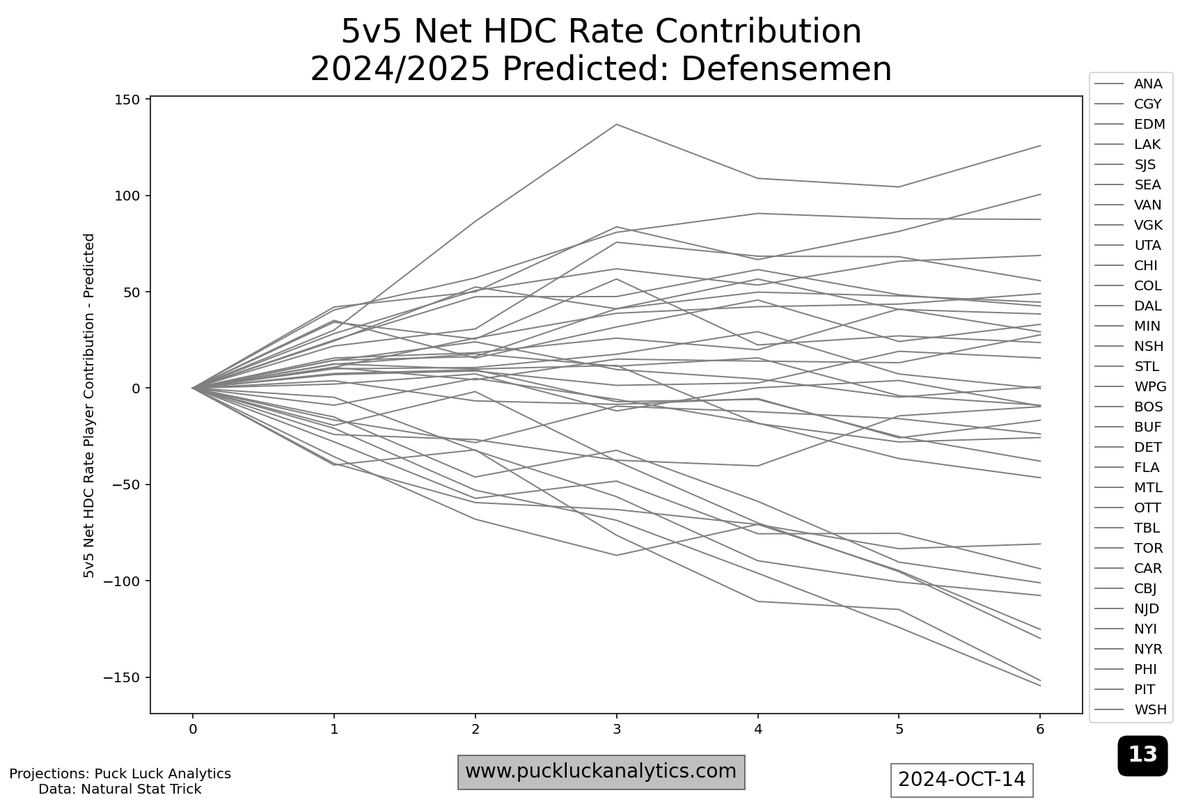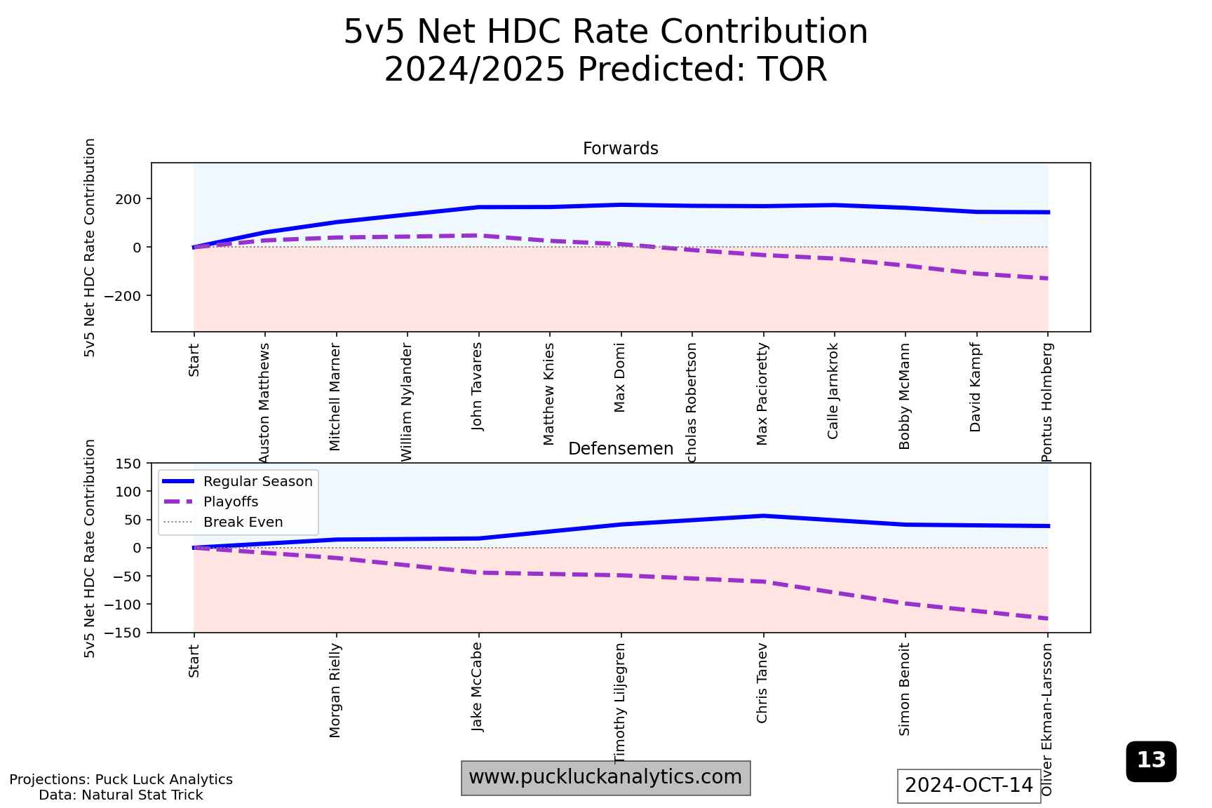 After both last year’s cup finalists, I included the Toronto Maple Leafs as a third example because they are the top rated team in the 2024/2025 model as of the start of the season. Still, their HDC Rate Contribution Worm show issues that could be more problematic in the playoffs than the two other examples. Their forward worm flattens around #5 on the depth chart. That means, come playoff time, they’re expected to be fighting a sub 50% 5v5 HDCF% for lines 2-4. A relatively flat start to the defense worm is the other issue that jumps out. The top pair will see the most ice time, potentially against the toughest competition, and having them run a net high danger Corsi deficit could be costly. Trade deadline targets should include a top pair D and middle six forwards, both with an considerable attention on high danger Corsi contributions.