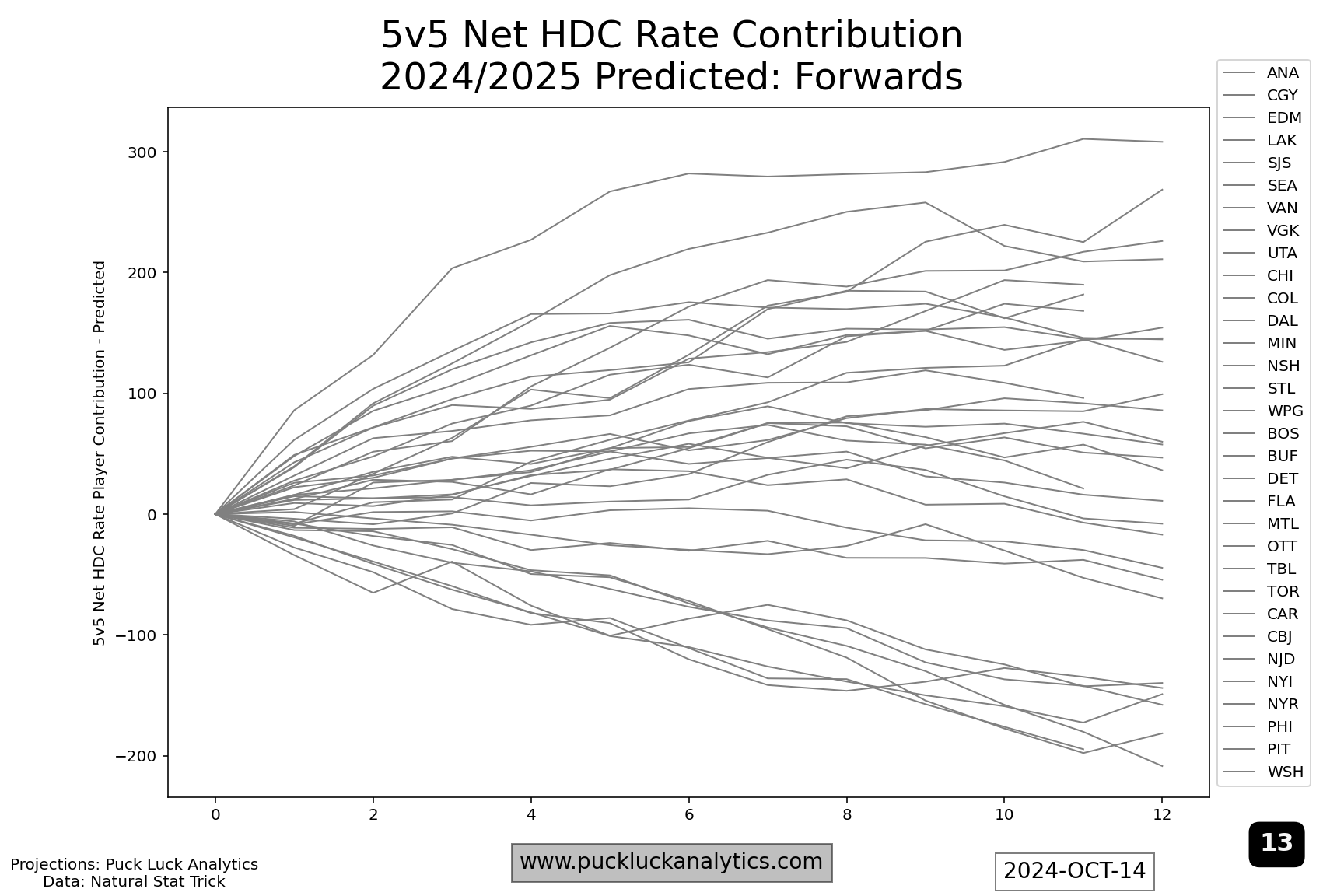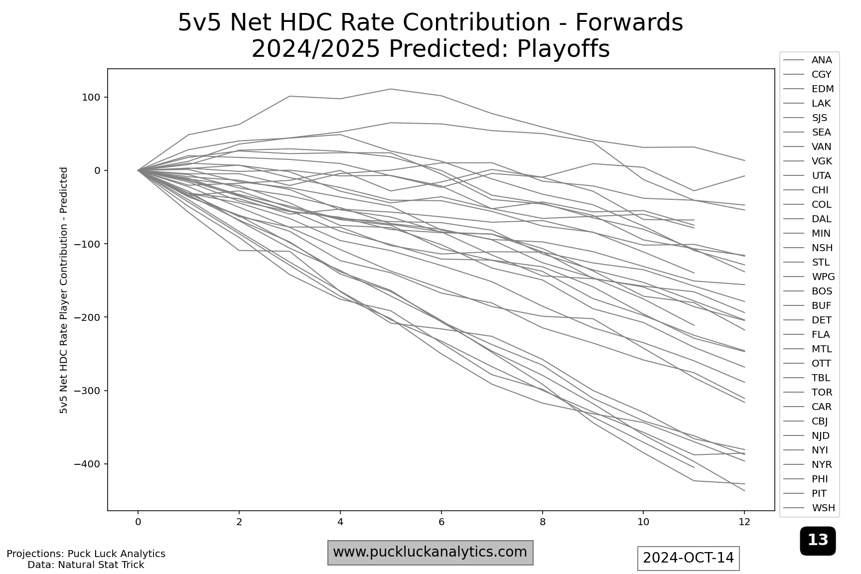 Here, I’ve put all 32 teams on a single graph to show the variety in outcomes. There are a couple of things we’re interested in for each line. First, the magnitude at the right hand side. This is the magnitude of the net HDC Rate Contribution for the top 12 forwards on the depth chart (the few that are short are due to rookies not yet in the model) and it’s the first check here for contenders. Contenders should be high on the right side. Second, does the worm steadily rise from left to right or does it include flat spots or drops? Flat spots or declines indicate weak points in the roster, which may be masked over in the regular season will be exaggerated come playoff time.