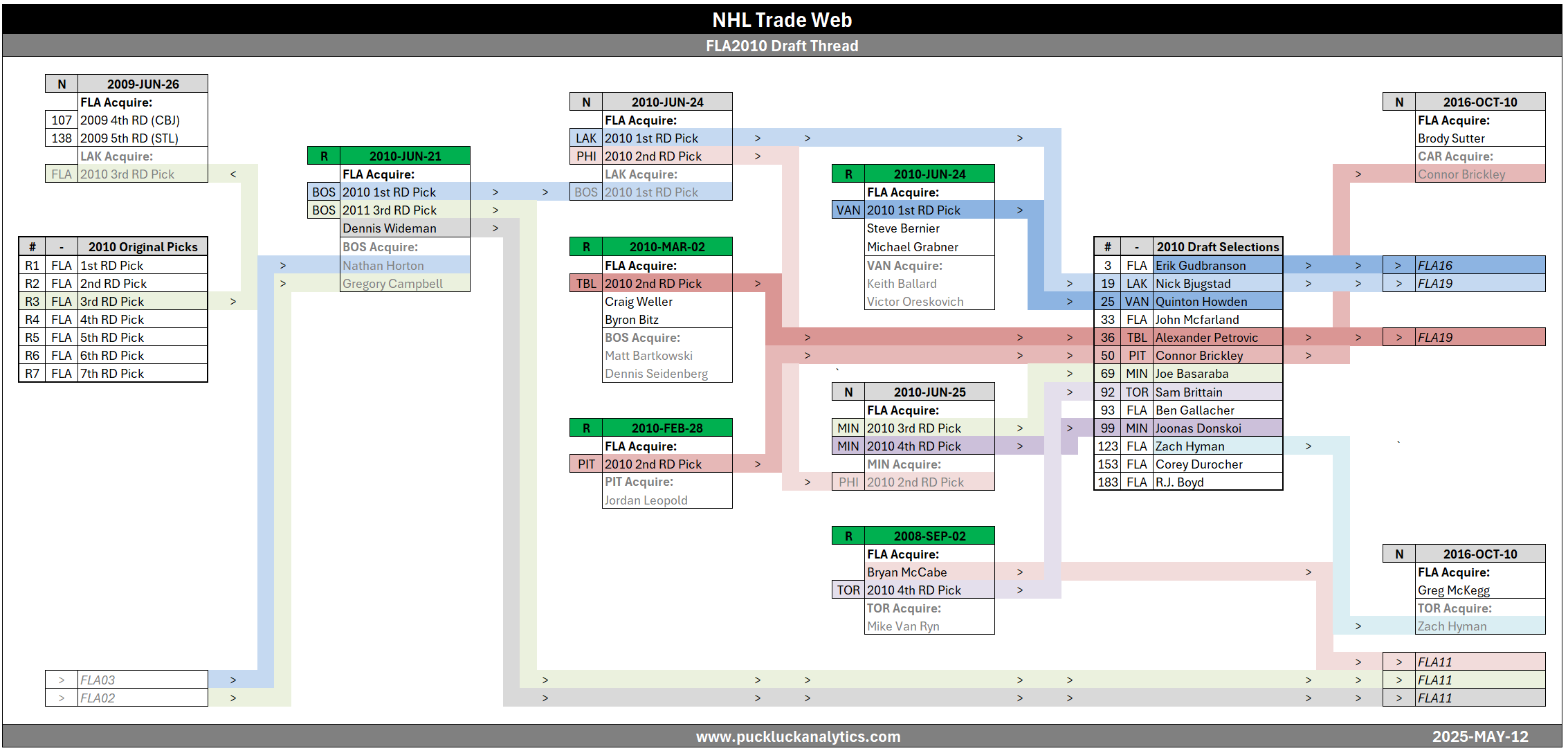 While there are a couple of roots going back pre-salary cap, the real beginnings of the Panthers ascent to the Stanley Cup began at the 2010 draft. They had 13 picks that year, including 3 first rounders. Their own was 3rd overall, which they used to select Eric Gudbranson. Nathan Horton and Gregory Campbell were packaged in a deal with the Boston Bruins, bringing the Panthers the 19th overall pick which they used to select Nick Bjugstad.