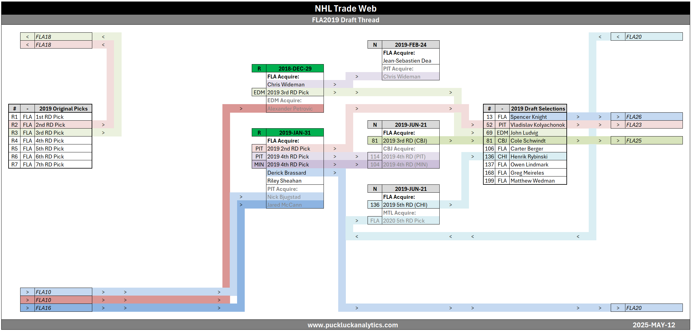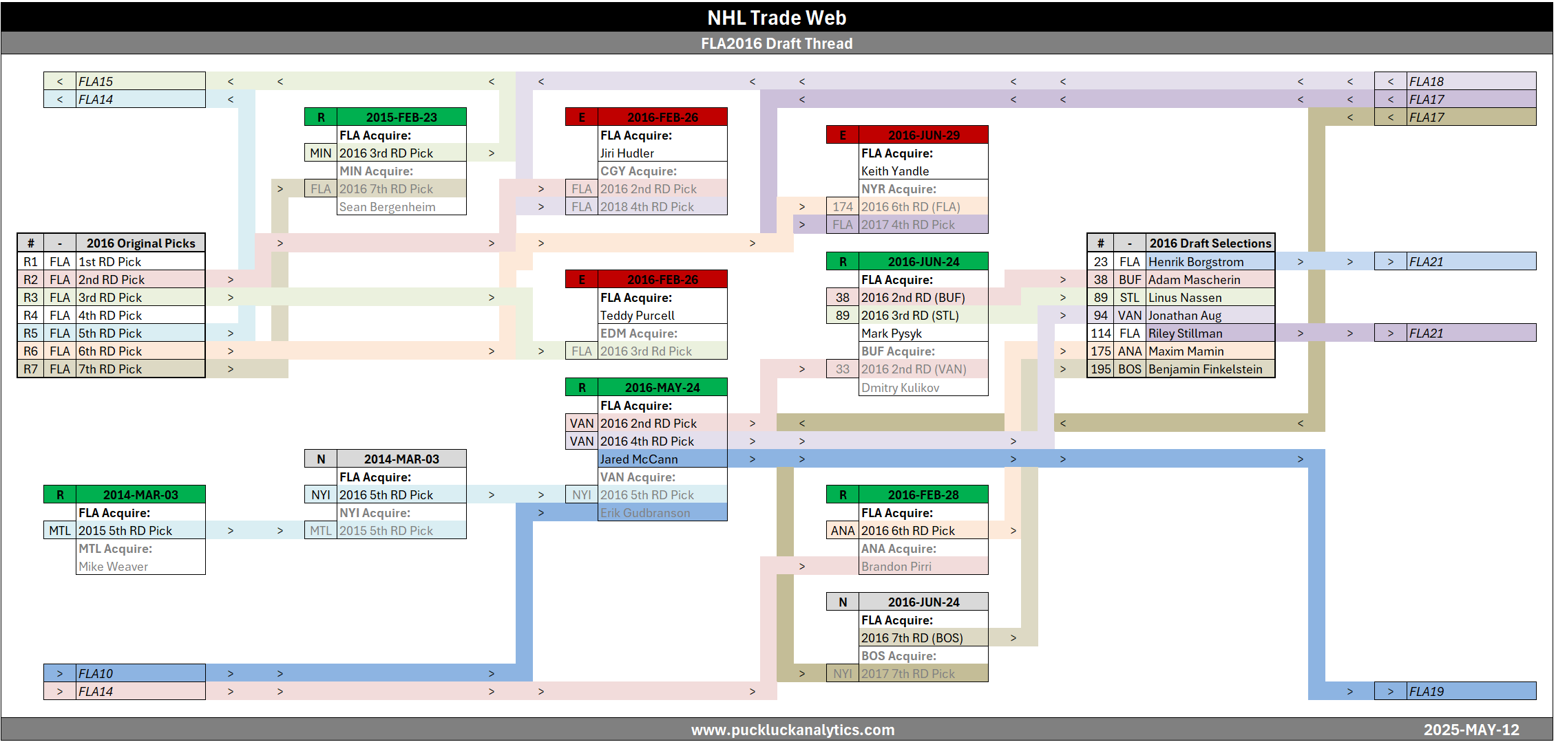 Finally, the Panthers took a huge swing to acquire Matthew Tkachuk (2016) for a 1st round pick, Jonathan Huberdeau, MacKenzie Weegar and Cole Schwindt. Not only did this deal consolidate a number of good assets into a great player early in his prime, it finished shifting the Panthers contention cohort to the 2013-2016 drafts by offloading Huberdeau (2011) and Weegar (2013) with other notable picks from the 2010 to 2012 drafts already gone. That put the contention cohort right in their prime and truly opened their cup window. (And yes, Cole Schwindt is the connection from Gregory Campbell and Nathan Horton to Matthew Tkachuk.)