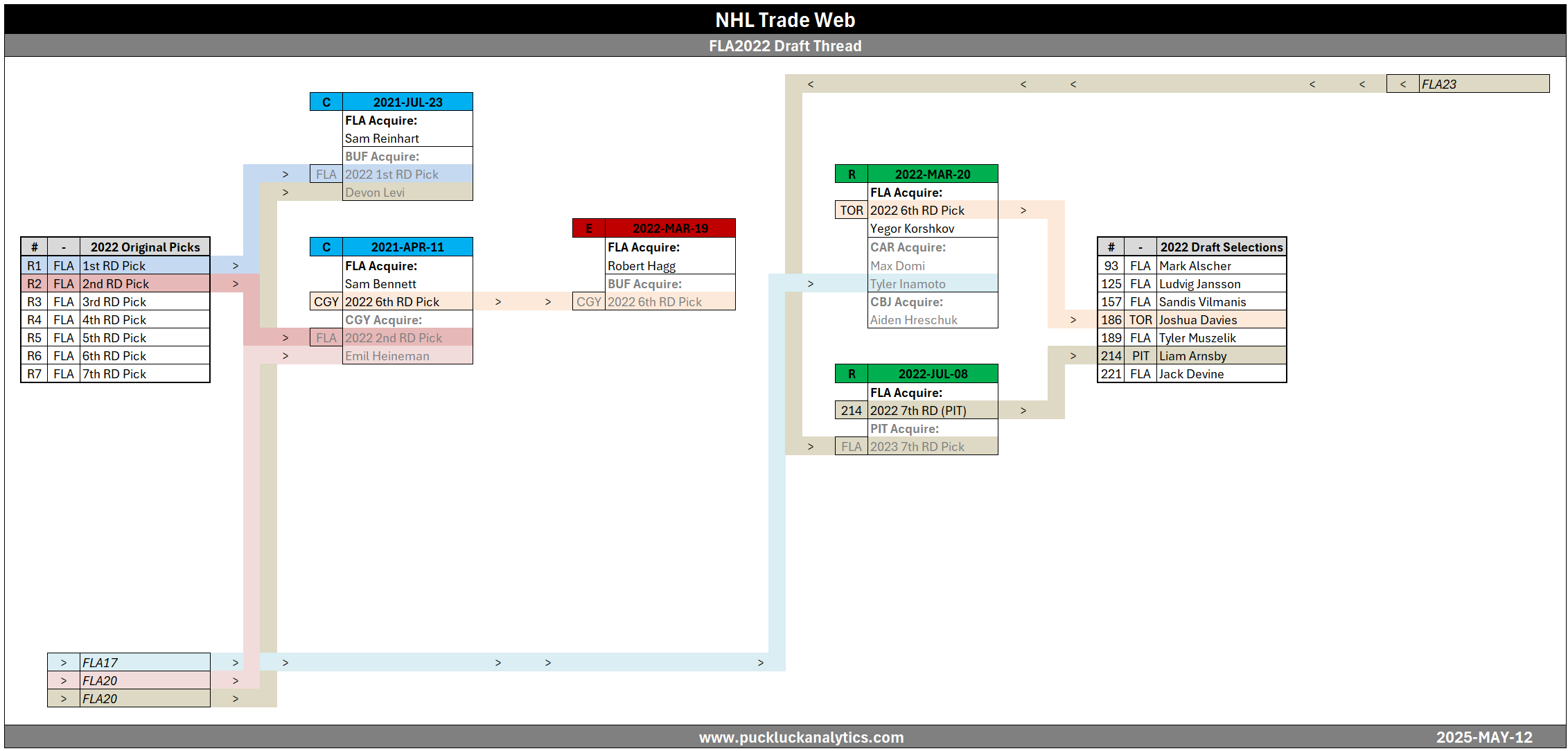 Over the course of 2021 and 2022, the Panthers consolidated future draft picks and assets from their contention cohort and secondary cohort into impact players that fit their contention cohort age group. Brandon Montour (2014) was acquired for a 3rd round pick. Sam Bennett (2014) was acquired for a 2nd round pick and Emil Heineman (Pick + secondary cohort). Sam Reinhart (2014) was acquire for a pick and Devon Levi (Pick + secondary cohort).