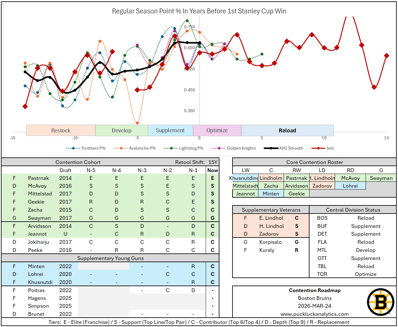 The Boston Bruins broke the chart. They’re the living embodiment of the idea that teams should be able to regenerate their roster indefinitely. They’ve been retooling for 15 years already and look well positioned to continue to do so for the foreseeable future.