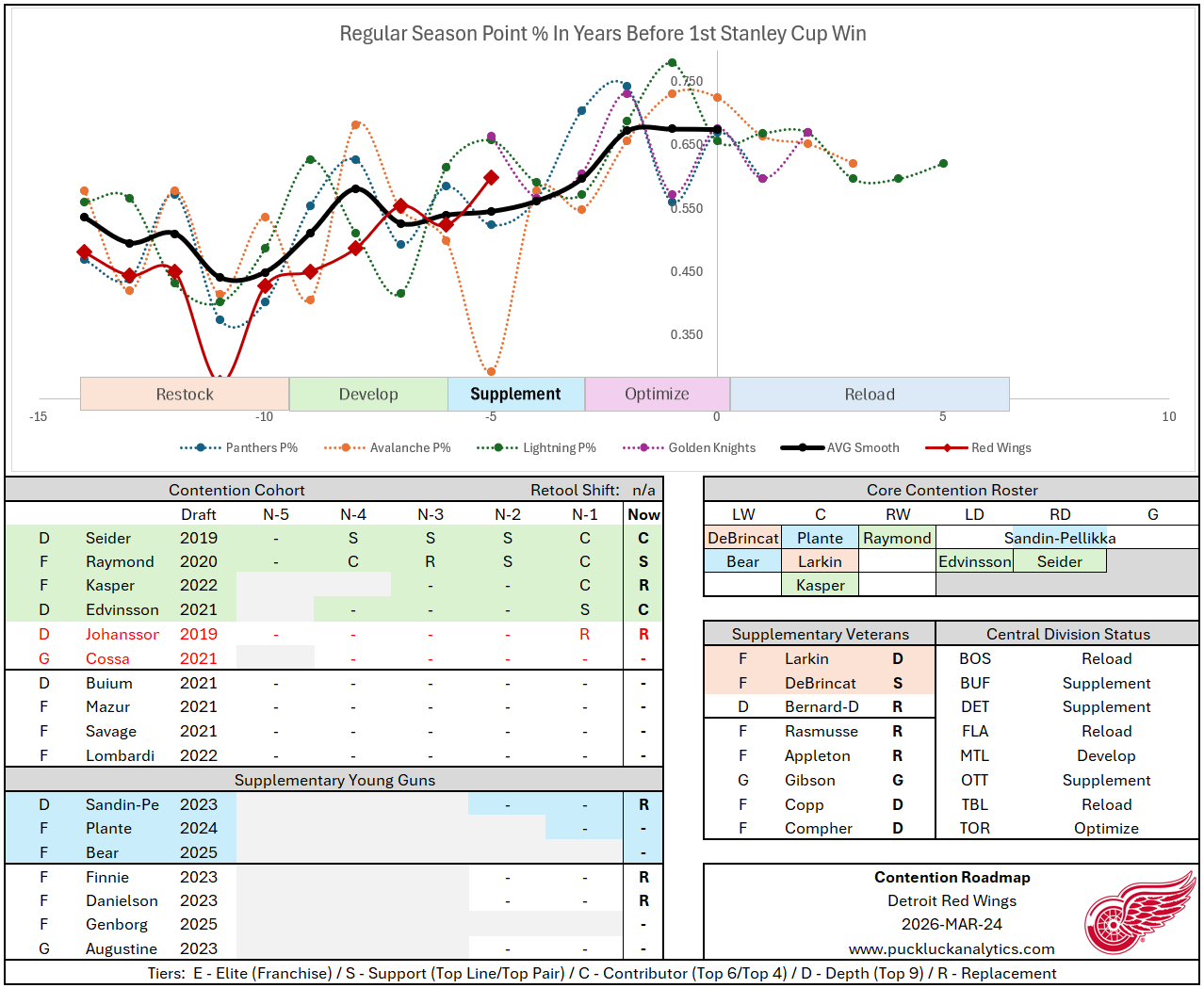 The Red Wings haven’t climbed out of the basement as quickly as the previous cup winners and a look at their Contention Cohort provides a plausible explanation. It looks quite possible that this group just isn’t strong enough to lead a team in a contention window. If prospects aren’t seeing NHL action by D+5, chances are very slim that they’ll play a significant role in the NHL at any point. There are more promising prospects in the pipeline, but the whole process looks misaligned at this juncture. It’s may not be derailed yet, but the Yzerplan is teetering on the rails right now.