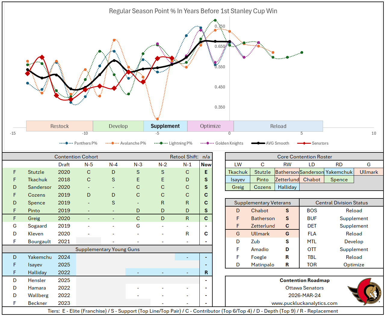 Where the Senators situation differs from the Red Wings is the size of their Contention Cohort. The Senators have a reasonable collection of skilled players that could be expected to lead a team in contention. There are a few quality prospects in the system as well that look like they could fill some holes in the contention group. There’s opportunity in the Atlantic Division right now. If the Senators can find a way to upgrade or add a big piece, they could be in the mix to be one of the next Atlantic Division powers.