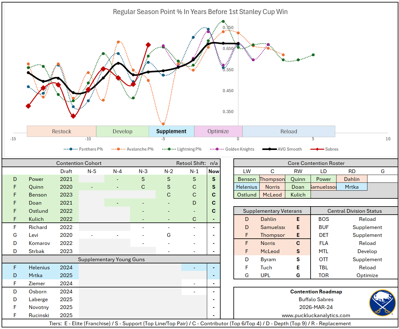 The Sabres are riding a young group in their charge to the top of the Atlantic Division this season. Sure, there are a few vets sprinkled in, but the balance of the core is still approaching or just reaching their prime. The pieces are there for the Sabres to maintain this year’s momentum and truly turn our expectations of them upsidedown. There’s a strong Contention Cohort developing with a few very strong veteran pieces. The biggest question may be if they can supplement this group with a couple more younger pieces. Konsta Helenius and Radim Mrtka look like they could be those pieces. Will the Sabres be patient enough to carry their momentum after such a long playoff absence?