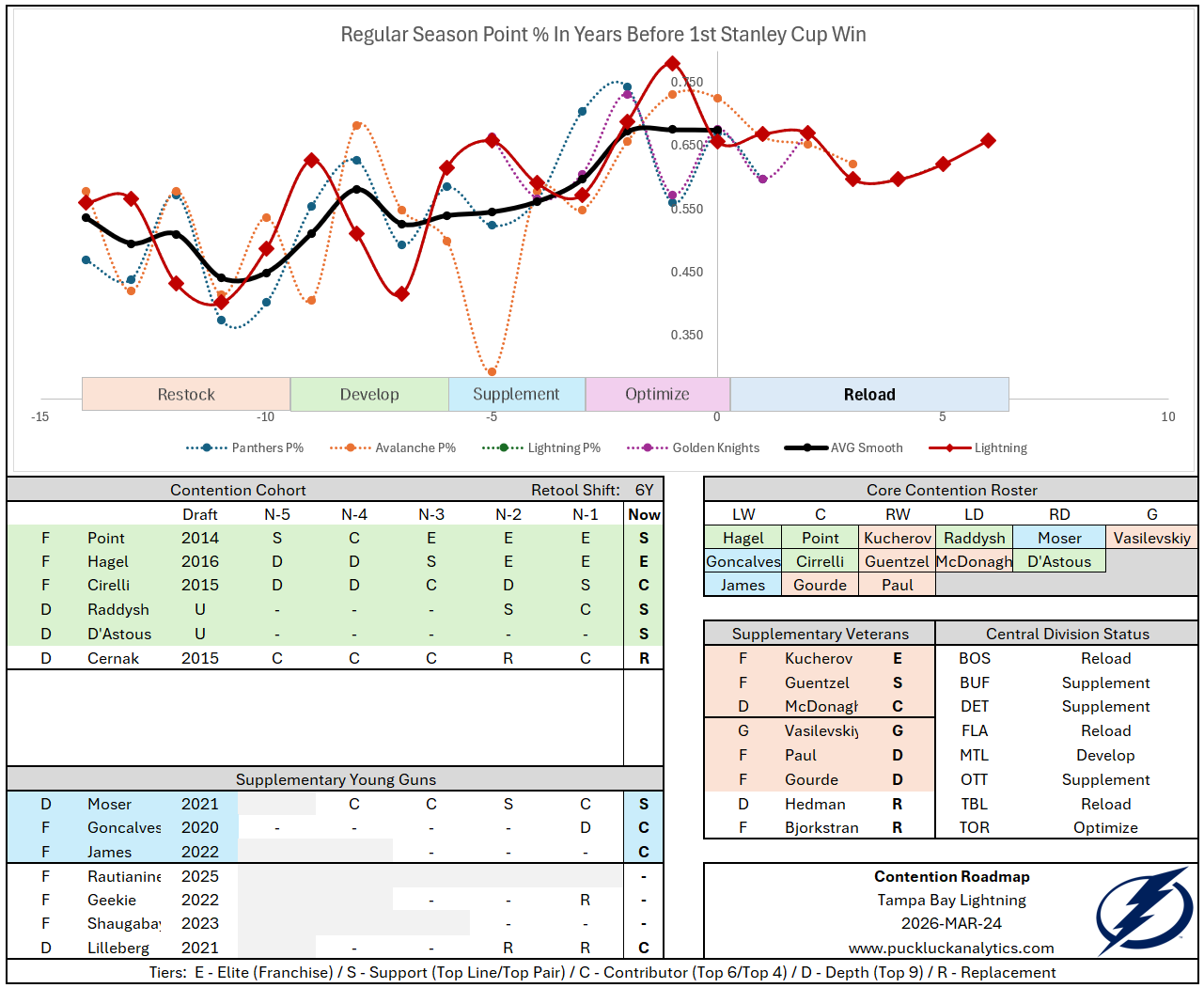 The Lightning have made moves to get younger of the past few seasons. Steven Stamkos is gone. Jake Guentzel and Brandon Hagel were brought in. They keep finding/producing legitimate NHLers from places other than the first round of the draft. The Contention Cohort is getting thinner though, with Brayden Point next to move to the veteran group. Their challenge going forward will be to continue to move on from some of their veterans and turn them into suitable replacements in their prime.